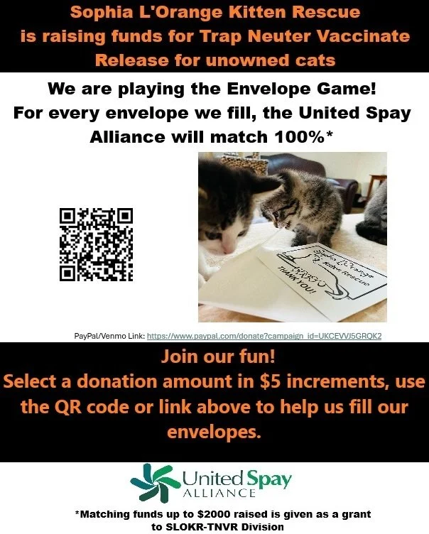 The Envelope game is part of the United Spay Alliance grant program with a goal for SLOKR-TNVR division to raise $2000 which will be matched by the United Spay Alliance.